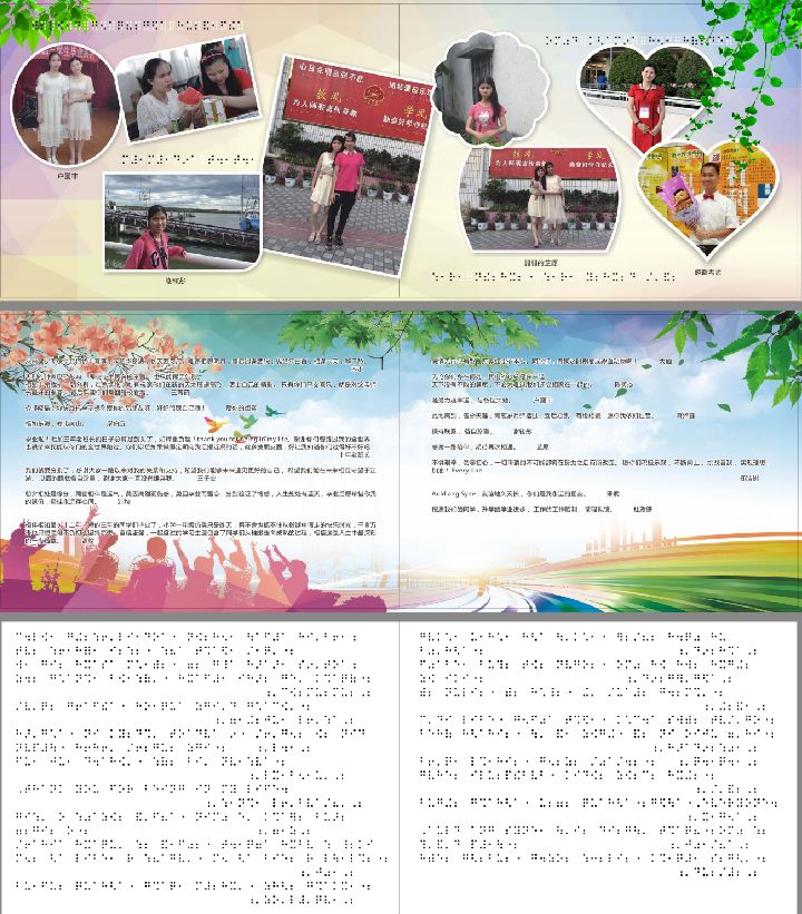 7月初,正值畢業(yè)季,生產(chǎn)中心機器不斷轟鳴,大伙正如火如荼的制作著一本本精美的畢業(yè)紀念冊。就在此時,我們卻接到了一批非常特殊的畢業(yè)紀念冊訂單--"盲文紀念冊 ? ?"。當客人提出這批畢業(yè)紀念冊制作需要集觸覺、聽覺和視覺于一體,便于盲人識別時,大伙都迷糊了,紀念冊制作如何體現(xiàn)觸覺和聽覺識別?這是個全新的難題。面對挑戰(zhàn),天意人敢于創(chuàng)新,在與客人深入溝通了解需求,我們充分探討各種可能性后,毅然接下這個特殊的訂單項目,因為天意志在"讓印刷走進千家萬戶,為幸福生活添色加彩",而這也是我們天意人使命體現(xiàn)! ? ? ?