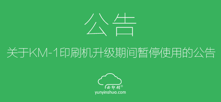 ? ? ? 您好!云印刷生產中心的柯尼卡美能達KM-1噴墨印刷機將于5月18日-6月3日期間進行軟件系統(tǒng)和硬件設備升級,升級期間將暫停使用,屆時所下的訂單將安排至其他印刷機進行生產,如給您造成不便敬請諒解!
