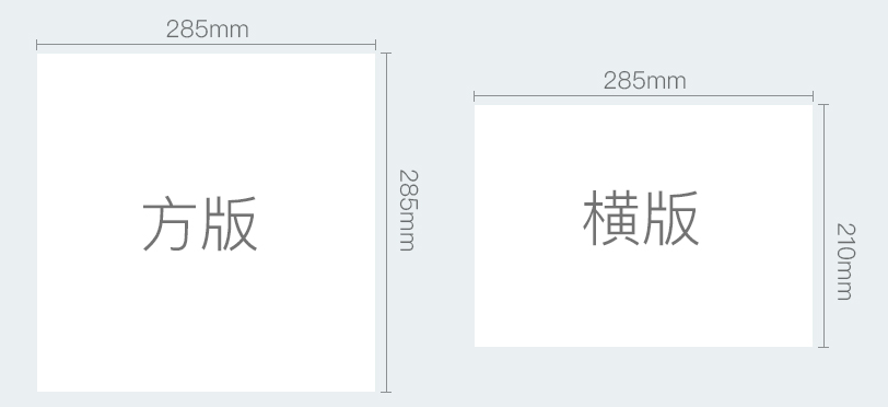 橫款與豎款的區(qū)別一般指的是長(zhǎng)邊既285mm所在的方位,長(zhǎng)邊為底邊則是橫款,長(zhǎng)邊若為高,則是豎款。如果底邊與高都是285mm,則是12寸方款畫冊(cè)。同樣的道理應(yīng)用于6寸及8寸的畫冊(cè)上。6寸:100mm X 145mm;8寸: ?140mm X 195mm;