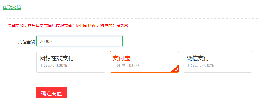 第三步:在充值頁(yè)面輸入要充值的金額,選擇支付方式后點(diǎn)擊“確定充值”按鈕跳轉(zhuǎn)到對(duì)應(yīng)的支付充值頁(yè)面。
